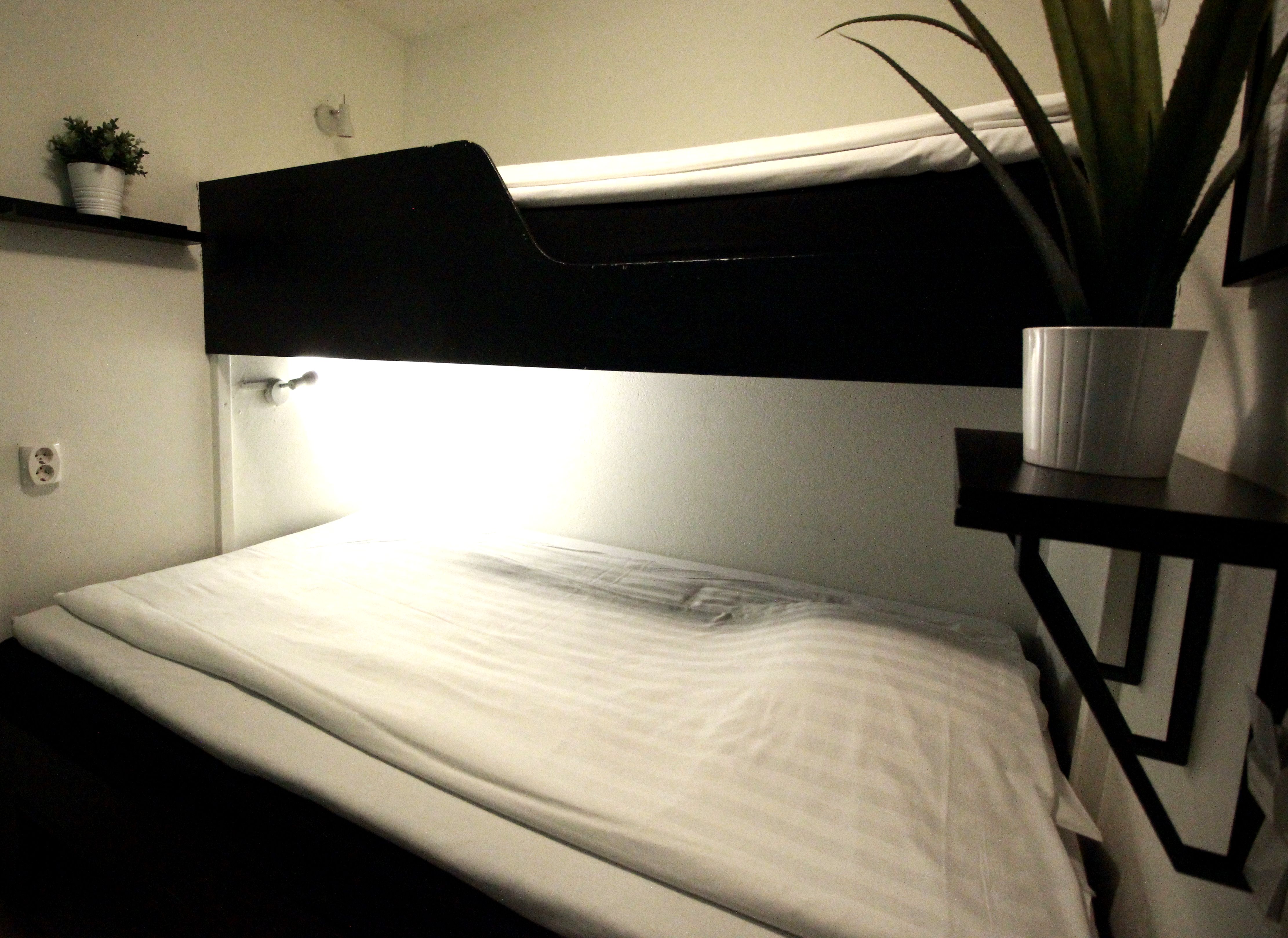 There is a comfortable bed, shower, toilet, TV, 100 mbit wifi, airconditioning and a folding desk/chair.