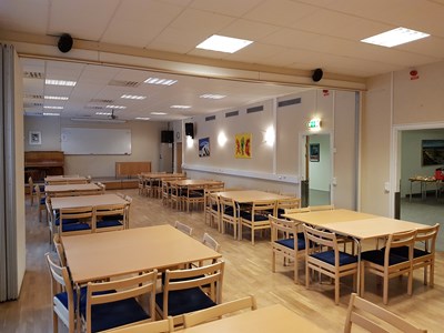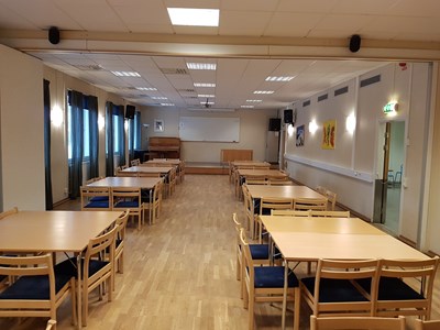 AB-SALEN is big enough to handle "school seating" for about 80 people and "Cinema seating" for about 100 people.